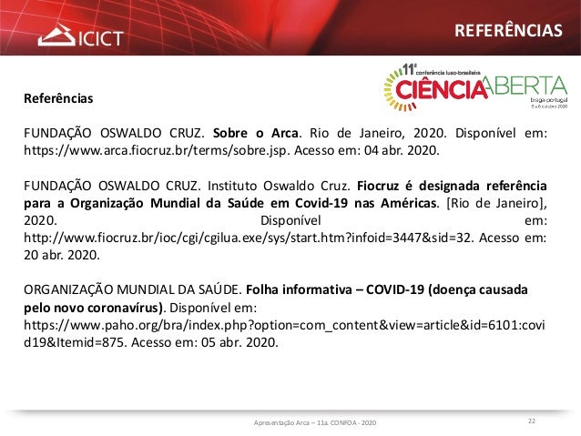22. 22. 22 REFERÊNCIAS Referências FUNDAÇÃO OSWALDO CRUZ. Sobre o Arca. Rio de Janeiro, 2020. Disponível em: https://www.arca.fiocruz.br/terms/sobre.jsp. Acesso em: 04 abr. 2020. FUNDAÇÃO OSWALDO CRUZ. Instituto Oswaldo Cruz. Fiocruz é designada referência para a Organização Mundial da Saúde em Covid-19 nas Américas. [Rio de Janeiro], 2020. Disponível em: http://www.fiocruz.br/ioc/cgi/cgilua.exe/sys/start.htm?infoid=3447&sid=32. Acesso em: 20 abr. 2020. ORGANIZAÇÃO MUNDIAL DA SAÚDE. Folha informativa – COVID-19 (doença causada pelo novo coronavírus). Disponível em: https://www.paho.org/bra/index.php?option=com_content&view=article&id=6101:covi d19&Itemid=875. Acesso em: 05 abr. 2020. Apresentação Arca – 11a. CONFOA - 2020