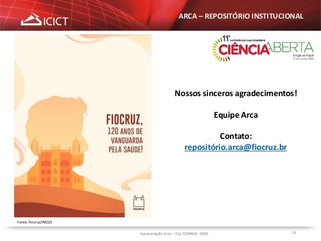 23. 23. 23 ARCA – REPOSITÓRIO INSTITUCIONAL Nossos sinceros agradecimentos! Equipe Arca Contato: repositório.arca@fiocruz.br Fonte: Fiocruz/INCQS Apresentação Arca – 11a. CONFOA - 2020