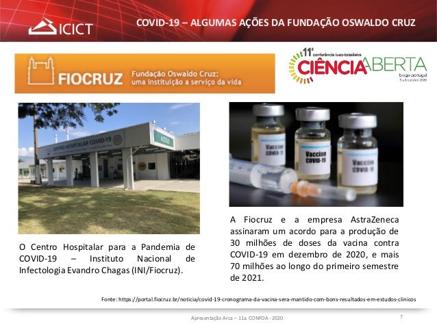 7. 7. 7Apresentação Arca – 11a. CONFOA - 2020 O Centro Hospitalar para a Pandemia de COVID-19 – Instituto Nacional de Infectologia Evandro Chagas (INI/Fiocruz). A Fiocruz e a empresa AstraZeneca assinaram um acordo para a produção de 30 milhões de doses da vacina contra COVID-19 em dezembro de 2020, e mais 70 milhões ao longo do primeiro semestre de 2021. COVID-19 – ALGUMAS AÇÕES DA FUNDAÇÃO OSWALDO CRUZ Fonte: https://portal.fiocruz.br/noticia/covid-19-cronograma-da-vacina-sera-mantido-com-bons-resultados-em-estudos-clinicos