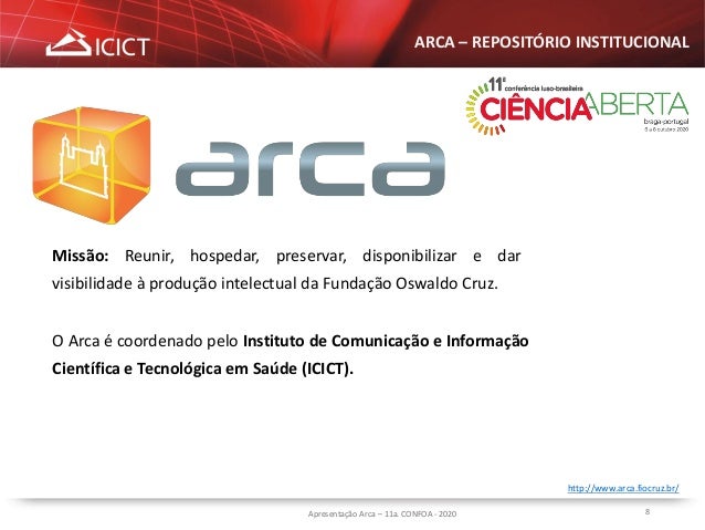 9. 9. 9 ARCA – REPOSITÓRIO INSTITUCIONAL Apresentação Arca – 11a. CONFOA - 2020 http://www.arca.fiocruz.br/