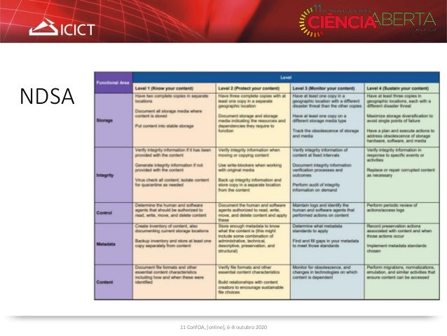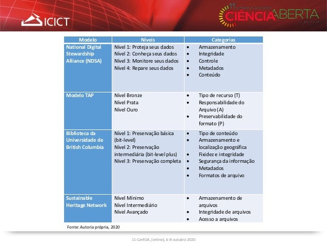 11. 11. 11 ConfOA, [online], 6-8 outubro 2020 Modelo Níveis Categorias National Digital Stewardship Alliance (NDSA) Nível 1: Proteja seus dados Nível 2: Conheça seus dados Nível 3: Monitore seus dados Nível 4: Repare seus dados  Armazenamento  Integridade  Controle  Metadados  Conteúdo Modelo TAP Nível Bronze Nível Prata Nível Ouro  Tipo de recurso (T)  Responsabilidade do Arquivo (A)  Preservabilidade do formato (P) Biblioteca da Universidade de British Columbia Nível 1: Preservação básica (bit-level) Nível 2: Preservação intermediária (bit-level plus) Nível 3: Preservação completa  Tipo de conteúdo  Armazenamento e localização geográfica  Fixidez e integridade  Segurança da informação  Metadados  Formatos de arquivo Sustainable Heritage Network Nível Mínimo Nível Intermediário Nível Avançado  Armazenamento de arquivos  Integridade de arquivos  Acesso a arquivos Fonte: Autoria própria, 2020