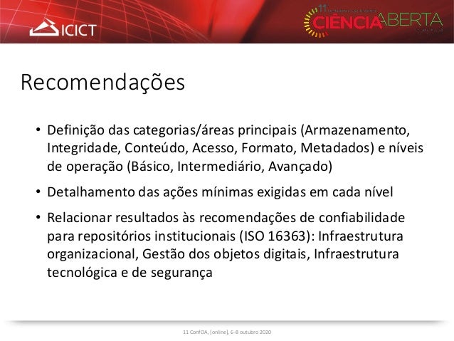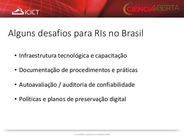 2. 2. Alguns desafios para RIs no Brasil • Infraestrutura tecnológica e capacitação • Documentação de procedimentos e práticas • Autoavaliação / auditoria de confiabilidade • Políticas e planos de preservação digital 11 ConfOA, [online], 6-8 outubro 2020