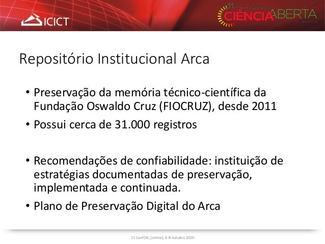 3. 3. Repositório Institucional Arca • Preservação da memória técnico-científica da Fundação Oswaldo Cruz (FIOCRUZ), desde 2011 • Possui cerca de 31.000 registros • Recomendações de confiabilidade: instituição de estratégias documentadas de preservação, implementada e continuada. • Plano de Preservação Digital do Arca 11 ConfOA, [online], 6-8 outubro 2020