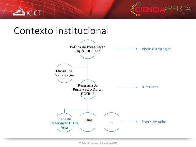 4. 4. Contexto institucional 11 ConfOA, [online], 6-8 outubro 2020 Política de Preservação Digital FIOCRUZ Plano de Preservação Digital Arca Programa de Preservação Digital FIOCRUZ Plano ... Manual de Digitalização ... Visão estratégica Diretrizes Plano de ação