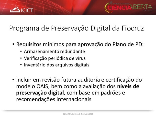 5. 5. Programa de Preservação Digital da Fiocruz • Requisitos mínimos para aprovação do Plano de PD: • Armazenamento redundante • Verificação periódica de vírus • Inventário dos arquivos digitais • Incluir em revisão futura auditoria e certificação do modelo OAIS, bem como a avaliação dos níveis de preservação digital, com base em padrões e recomendações internacionais 11 ConfOA, [online], 6-8 outubro 2020
