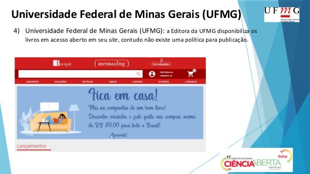 10. 10. Universidade Federal de Minas Gerais (UFMG) 4) Universidade Federal de Minas Gerais (UFMG): a Editora da UFMG disponibiliza os livros em acesso aberto em seu site, contudo não existe uma política para publicação.
