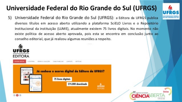 11. 11. Universidade Federal do Rio Grande do Sul (UFRGS) 5) Universidade Federal do Rio Grande do Sul (UFRGS): a Editora da UFRGS publica diversos títulos em acesso aberto utilizando a plataforma SciELO Livros e o Repositório Institucional da instituição (LUME), atualmente existem 75 livros digitais. No momento não existe política de acesso aberto aprovada, pois esta se encontra em conclusão junto ao conselho editorial, que já realizou algumas reuniões a respeito.