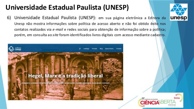 12. 12. Universidade Estadual Paulista (UNESP) 6) Universidade Estadual Paulista (UNESP): em sua página eletrônica a Editora da Unesp não mostra informações sobre política de acesso aberto e não foi obtido êxito nos contatos realizados via e-mail e redes sociais para obtenção de informação sobre a política; porém, em consulta ao site foram identificados livros digitais com acesso mediante cadastro.