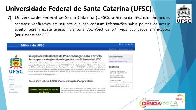 13. 13. Universidade Federal de Santa Catarina (UFSC) 7) Universidade Federal de Santa Catarina (UFSC): a Editora da UFSC não retornou os contatos; verificamos em seu site que não constam informações sobre política de acesso aberto, porém existe acesso livre para download de 57 livros publicados em e-books (atualmente são 65).