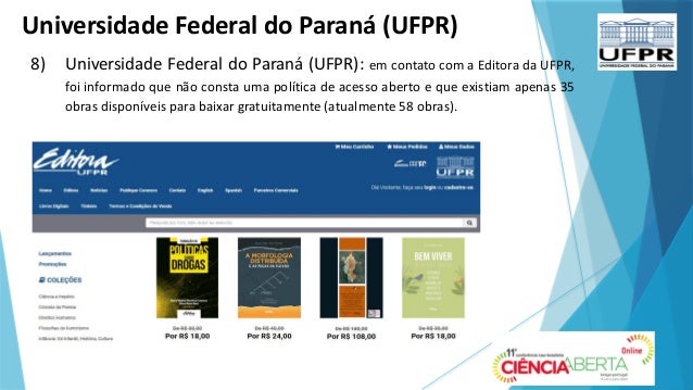 14. 14. Universidade Federal do Paraná (UFPR) 8) Universidade Federal do Paraná (UFPR): em contato com a Editora da UFPR, foi informado que não consta uma política de acesso aberto e que existiam apenas 35 obras disponíveis para baixar gratuitamente (atualmente 58 obras).