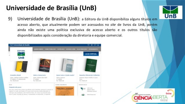 15. 15. Universidade de Brasília (UnB) 9) Universidade de Brasília (UnB): a Editora da UnB disponibiliza alguns títulos em acesso aberto, que atualmente podem ser acessados no site de livros da UnB, porém ainda não existe uma política exclusiva de acesso aberto e os outros títulos são disponibilizados após consideração da diretoria e equipe comercial.