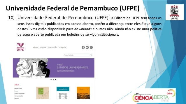 16. 16. Universidade Federal de Pernambuco (UFPE) 10) Universidade Federal de Pernambuco (UFPE): a Editora da UFPE tem todos os seus livros digitais publicados em acesso aberto, porém a diferença entre eles é que alguns destes livros estão disponíveis para downloads e outros não. Ainda não existe uma política de acesso aberto publicada em boletins de serviço institucionais.