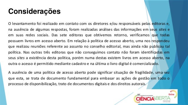 17. 17. Considerações O levantamento foi realizado em contato com os diretores e/ou responsáveis pelas editoras e, na ausência de algumas respostas, foram realizadas análises das informações em seus sites e em suas redes sociais. Das sete editoras que obtivemos retorno, verificamos que todas possuem livros em acesso aberto. Em relação à política de acesso aberto, uma nos respondeu que realizou reuniões referente ao assunto no conselho editorial, mas ainda não publicou tal política. Nas outras três editoras que não conseguimos contato não foram identificadas em seus sites a existência desta política, porém numa destas existem livros em acesso aberto, na outra o acesso é permitido mediante cadastro e na última o livro digital é comercializado. A ausência de uma política de acesso aberto pode significar situação de fragilidade, uma vez que esta, se trata de documento fundamental para embasar as ações de gestão em todo o processo de disponibilização, trato de documentos digitais e dos direitos autorais.