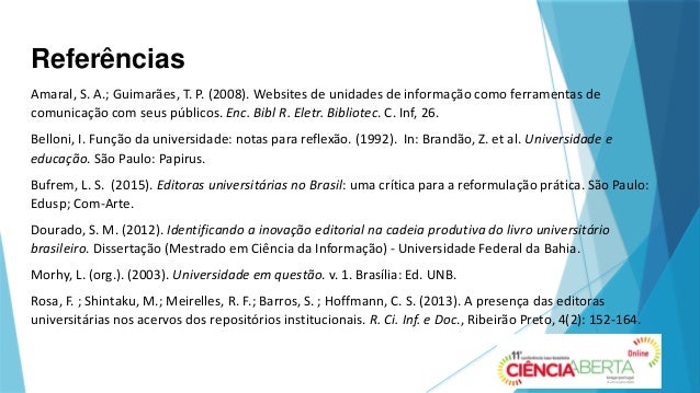 18. 18. Referências Amaral, S. A.; Guimarães, T. P. (2008). Websites de unidades de informação como ferramentas de comunicação com seus públicos. Enc. Bibl R. Eletr. Bibliotec. C. Inf, 26. Belloni, I. Função da universidade: notas para reflexão. (1992). In: Brandão, Z. et al. Universidade e educação. São Paulo: Papirus. Bufrem, L. S. (2015). Editoras universitárias no Brasil: uma crítica para a reformulação prática. São Paulo: Edusp; Com-Arte. Dourado, S. M. (2012). Identificando a inovação editorial na cadeia produtiva do livro universitário brasileiro. Dissertação (Mestrado em Ciência da Informação) - Universidade Federal da Bahia. Morhy, L. (org.). (2003). Universidade em questão. v. 1. Brasília: Ed. UNB. Rosa, F. ; Shintaku, M.; Meirelles, R. F.; Barros, S. ; Hoffmann, C. S. (2013). A presença das editoras universitárias nos acervos dos repositórios institucionais. R. Ci. Inf. e Doc., Ribeirão Preto, 4(2): 152-164.
