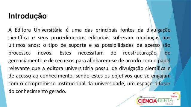 2. 2. Introdução A Editora Universitária é uma das principais fontes da divulgação científica e seus procedimentos editoriais sofreram mudanças nos últimos anos: o tipo de suporte e as possibilidades de acesso são processos novos. Estes necessitam de reestruturação, de gerenciamento e de recursos para alinharem-se de acordo com o papel relevante que a editora universitária possui de divulgação científica e de acesso ao conhecimento, sendo estes os objetivos que se engajam com o compromisso institucional da universidade, um espaço difusor do conhecimento gerado.