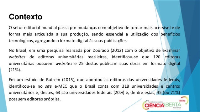 3. 3. Contexto O setor editorial mundial passa por mudanças com objetivo de tornar mais acessível e de forma mais articulada a sua produção, sendo essencial a utilização dos benefícios tecnológicos, agregando o formato digital às suas publicações. No Brasil, em uma pesquisa realizada por Dourado (2012) com o objetivo de examinar websites de editoras universitárias brasileiras, identificou-se que 120 editoras universitárias possuem websites e 25 destas publicam suas obras em formato digital (21%). Em um estudo de Bufrem (2015), que abordou as editoras das universidades federais, identificou-se no site e-MEC que o Brasil conta com 318 universidades e centros universitários e, destes, 63 são universidades federais (20%) e, dentre estas, 45 (ou 71%) possuem editoras próprias.