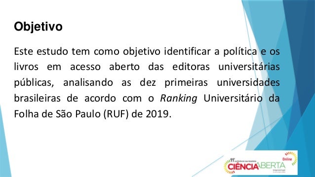 4. 4. Objetivo Este estudo tem como objetivo identificar a política e os livros em acesso aberto das editoras universitárias públicas, analisando as dez primeiras universidades brasileiras de acordo com o Ranking Universitário da Folha de São Paulo (RUF) de 2019.