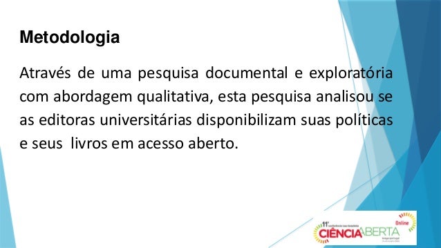 5. 5. Metodologia Através de uma pesquisa documental e exploratória com abordagem qualitativa, esta pesquisa analisou se as editoras universitárias disponibilizam suas políticas e seus livros em acesso aberto.