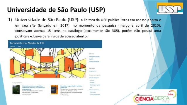 7. 7. Universidade de São Paulo (USP) 1) Universidade de São Paulo (USP): a Editora da USP publica livros em acesso aberto e em seu site (lançado em 2017), no momento da pesquisa (março e abril de 2020), constavam apenas 15 itens no catálogo (atualmente são 385), porém não possui uma política exclusiva para livros de acesso aberto.