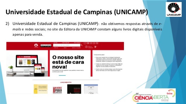 8. 8. Universidade Estadual de Campinas (UNICAMP) 2) Universidade Estadual de Campinas (UNICAMP): não obtivemos respostas através de e- mails e redes sociais; no site da Editora da UNICAMP constam alguns livros digitais disponíveis apenas para venda.