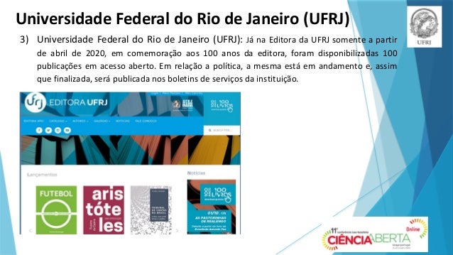 9. 9. Universidade Federal do Rio de Janeiro (UFRJ) 3) Universidade Federal do Rio de Janeiro (UFRJ): Já na Editora da UFRJ somente a partir de abril de 2020, em comemoração aos 100 anos da editora, foram disponibilizadas 100 publicações em acesso aberto. Em relação a política, a mesma está em andamento e, assim que finalizada, será publicada nos boletins de serviços da instituição.