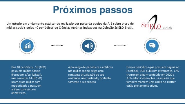11. 11. Dos 40 periódicos, 16 (40%) possuem mídias sociais (Facebook e/ou Twitter), mas somente 14 (87,5%) usam essas mídias com regularidade e possuem artigos com escores altmétricos. A presença de periódicos científicos nas mídias sociais exige uma constante atualização do seu conteúdo, não bastando, portanto, somente a sua criação. Desses periódicos que possuem página no Facebook, 50% publicam ativamente, 17% trouxeram algum conteúdo em 2020 e 33% estão inoperantes. Já aqueles que também mantêm uma conta no Twitter estão plenamente ativos. Próximos passos Um estudo em andamento está sendo realizado por parte da equipe da AIB sobre o uso de mídias sociais pelos 40 periódicos de Ciências Agrárias indexados na Coleção SciELO Brasil.