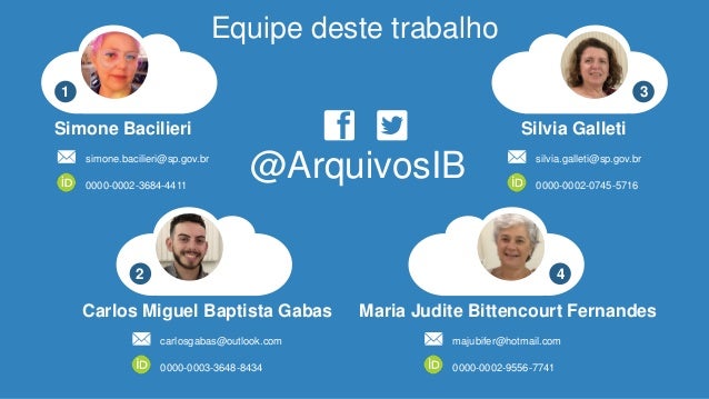 12. 12. Equipe deste trabalho simone.bacilieri@sp.gov.br 0000-0002-3684-4411 Simone Bacilieri 1 carlosgabas@outlook.com 0000-0003-3648-8434 Carlos Miguel Baptista Gabas 2 silvia.galleti@sp.gov.br 0000-0002-0745-5716 Silvia Galleti 3 majubifer@hotmail.com 0000-0002-9556-7741 Maria Judite Bittencourt Fernandes 4 @ArquivosIB