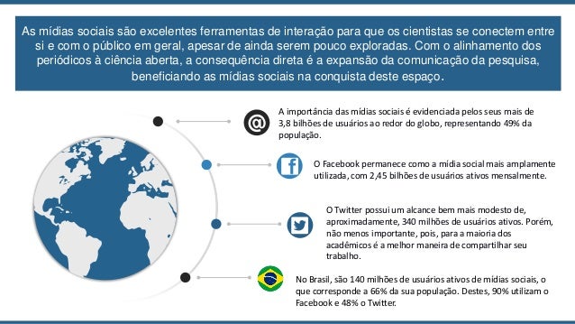 2. 2. As mídias sociais são excelentes ferramentas de interação para que os cientistas se conectem entre si e com o público em geral, apesar de ainda serem pouco exploradas. Com o alinhamento dos periódicos à ciência aberta, a consequência direta é a expansão da comunicação da pesquisa, beneficiando as mídias sociais na conquista deste espaço. A importância das mídias sociais é evidenciada pelos seus mais de 3,8 bilhões de usuários ao redor do globo, representando 49% da população. O Twitter possui um alcance bem mais modesto de, aproximadamente, 340 milhões de usuários ativos. Porém, não menos importante, pois, para a maioria dos acadêmicos é a melhor maneira de compartilhar seu trabalho. O Facebook permanece como a mídia social mais amplamente utilizada, com 2,45 bilhões de usuários ativos mensalmente. No Brasil, são 140 milhões de usuários ativos de mídias sociais, o que corresponde a 66% da sua população. Destes, 90% utilizam o Facebook e 48% o Twitter.