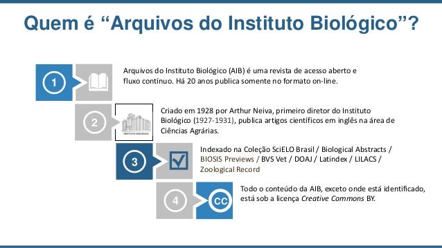 3. 3. Quem é “Arquivos do Instituto Biológico”? 11 Arquivos do Instituto Biológico (AIB) é uma revista de acesso aberto e fluxo contínuo. Há 20 anos publica somente no formato on-line. 3 Indexado na Coleção SciELO Brasil / Biological Abstracts / BIOSIS Previews / BVS Vet / DOAJ / Latindex / LILACS / Zoological Record Criado em 1928 por Arthur Neiva, primeiro diretor do Instituto Biológico (1927-1931), publica artigos científicos em inglês na área de Ciências Agrárias. 4 Todo o conteúdo da AIB, exceto onde está identificado, está sob a licença Creative Commons BY. 2 CC