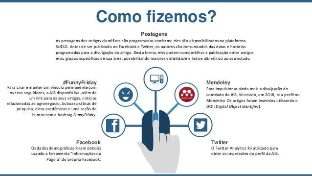 5. 5. Como fizemos? As postagens dos artigos científicos são programadas conforme eles são disponibilizados na plataforma SciELO. Antes de ser publicado no Facebook e Twitter, os autores são comunicados das datas e horários programados para a divulgação do artigo. Desta forma, eles podem compartilhar a publicação entre amigos e/ou grupos específicos de sua área, possibilitando maiores visibilidade e índice altmétrico ao seu estudo. Postagens O Twitter Analytics foi utilizado para obter as impressões do perfil da AIB. Twitter Os dados demográficos foram obtidos usando a ferramenta “Informações da Página” do próprio Facebook. Facebook Para criar e manter um vínculo permanente com os seus seguidores, a AIB disponibiliza, além de um link para os seus artigos, notícias relacionadas ao agronegócio, às boas práticas de pesquisa, dicas acadêmicas e uma seção de humor com a hashtag FunnyFriday. #FunnyFriday Para impulsionar ainda mais a divulgação do conteúdo da AIB, foi criado, em 2018, seu perfil no Mendeley. Os artigos foram inseridos utilizando o DOI (Digital Object Identifier). Mendeley