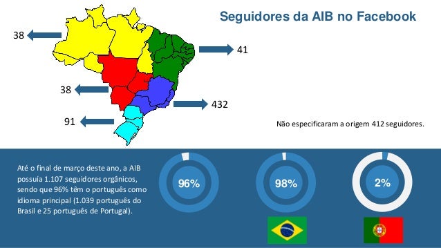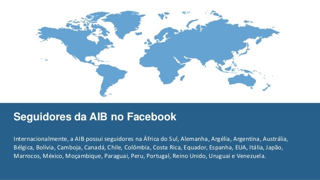 7. 7. Internacionalmente, a AIB possui seguidores na África do Sul, Alemanha, Argélia, Argentina, Austrália, Bélgica, Bolívia, Camboja, Canadá, Chile, Colômbia, Costa Rica, Equador, Espanha, EUA, Itália, Japão, Marrocos, México, Moçambique, Paraguai, Peru, Portugal, Reino Unido, Uruguai e Venezuela. Seguidores da AIB no Facebook
