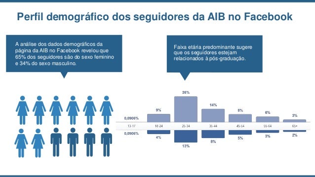 8. 8. A análise dos dados demográficos da página da AIB no Facebook revelou que 65% dos seguidores são do sexo feminino e 34% do sexo masculino. Perfil demográfico dos seguidores da AIB no Facebook Faixa etária predominante sugere que os seguidores estejam relacionados à pós-graduação.