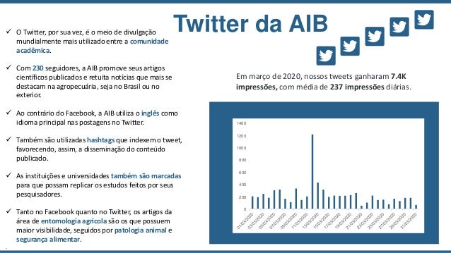 9. 9. Twitter da AIB O Twitter, por sua vez, é o meio de divulgação mundialmente mais utilizado entre a comunidade acadêmica.  Com 230 seguidores, a AIB promove seus artigos científicos publicados e retuita notícias que mais se destacam na agropecuária, seja no Brasil ou no exterior.  Ao contrário do Facebook, a AIB utiliza o inglês como idioma principal nas postagens no Twitter.  Também são utilizadas hashtags que indexem o tweet, favorecendo, assim, a disseminação do conteúdo publicado.  As instituições e universidades também são marcadas para que possam replicar os estudos feitos por seus pesquisadores.  Tanto no Facebook quanto no Twitter, os artigos da área de entomologia agrícola são os que possuem maior visibilidade, seguidos por patologia animal e segurança alimentar. . Em março de 2020, nossos tweets ganharam 7.4K impressões, com média de 237 impressões diárias. 0 200 400 600 800 1000 1200 1400