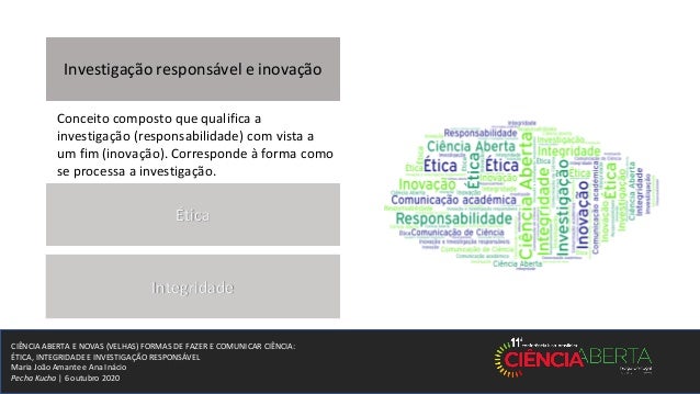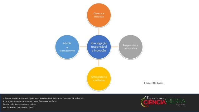 10. 10. CIÊNCIA ABERTA E NOVAS (VELHAS) FORMAS DE FAZER E COMUNICAR CIÊNCIA: ÉTICA, INTEGRIDADE E INVESTIGAÇÃO RESPONSÁVEL Maria João Amante e Ana Inácio Pecha Kucha | 6 outubro 2020 Investigação responsável e inovação Diversa e inclusiva Responsiva e adaptativa Antecipatória e reflexiva Aberta e transparente Fonte: RRI Tools