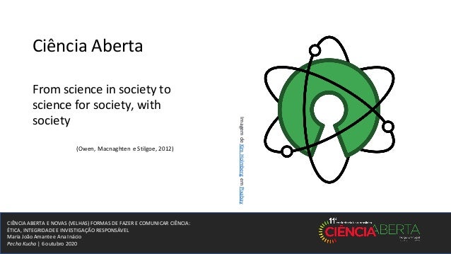 11. 11. CIÊNCIA ABERTA E NOVAS (VELHAS) FORMAS DE FAZER E COMUNICAR CIÊNCIA: ÉTICA, INTEGRIDADE E INVESTIGAÇÃO RESPONSÁVEL Maria João Amante e Ana Inácio Pecha Kucha | 6 outubro 2020 Ciência Aberta From science in society to science for society, with society (Owen, Macnaghten e Stilgoe, 2012) ImagemdeKimHolmbergemPixabay