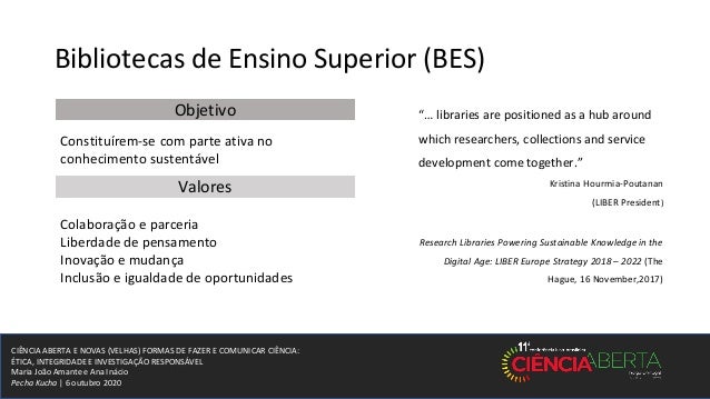 12. 12. CIÊNCIA ABERTA E NOVAS (VELHAS) FORMAS DE FAZER E COMUNICAR CIÊNCIA: ÉTICA, INTEGRIDADE E INVESTIGAÇÃO RESPONSÁVEL Maria João Amante e Ana Inácio Pecha Kucha | 6 outubro 2020 Bibliotecas de Ensino Superior (BES) Objetivo Valores Constituírem-se com parte ativa no conhecimento sustentável Colaboração e parceria Liberdade de pensamento Inovação e mudança Inclusão e igualdade de oportunidades “… libraries are positioned as a hub around which researchers, collections and service development come together.” Kristina Hourmia-Poutanan (LIBER President) Research Libraries Powering Sustainable Knowledge in the Digital Age: LIBER Europe Strategy 2018 – 2022 (The Hague, 16 November,2017)