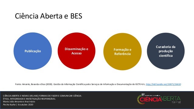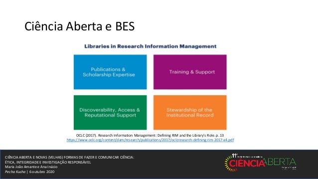 13. 13. CIÊNCIA ABERTA E NOVAS (VELHAS) FORMAS DE FAZER E COMUNICAR CIÊNCIA: ÉTICA, INTEGRIDADE E INVESTIGAÇÃO RESPONSÁVEL Maria João Amante e Ana Inácio Pecha Kucha | 6 outubro 2020 Ciência Aberta e BES OCLC (2017). Research Information Management: Defining RIM and the Library’s Role. p. 13 https://www.oclc.org/content/dam/research/publications/2017/oclcresearch-defining-rim-2017-a4.pdf