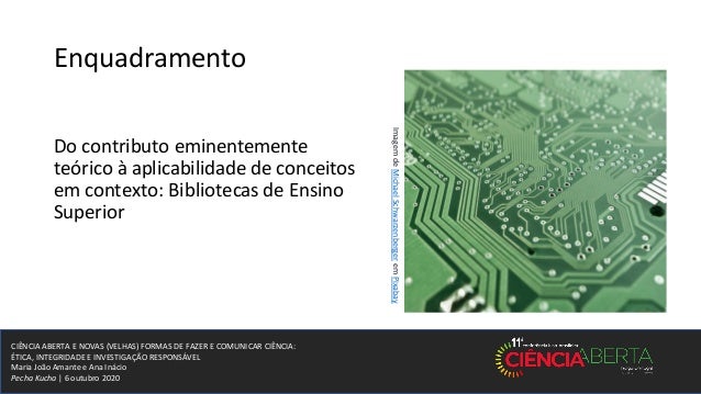 2. 2. CIÊNCIA ABERTA E NOVAS (VELHAS) FORMAS DE FAZER E COMUNICAR CIÊNCIA: ÉTICA, INTEGRIDADE E INVESTIGAÇÃO RESPONSÁVEL Maria João Amante e Ana Inácio Pecha Kucha | 6 outubro 2020 Enquadramento Do contributo eminentemente teórico à aplicabilidade de conceitos em contexto: Bibliotecas de Ensino Superior ImagemdeMichaelSchwarzenbergeremPixabay