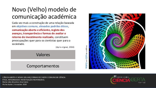3. 3. CIÊNCIA ABERTA E NOVAS (VELHAS) FORMAS DE FAZER E COMUNICAR CIÊNCIA: ÉTICA, INTEGRIDADE E INVESTIGAÇÃO RESPONSÁVEL Maria João Amante e Ana Inácio Pecha Kucha | 6 outubro 2020 Novo (Velho) modelo de comunicação académica Cada vez mais a construção de uma relação baseada em objetivos comuns, elevados padrões éticos, comunicação aberta e eficiente, registo dos avanços, transparência e formas de avaliar o retorno do investimento realizado, constituem preocupações quer para os cientistas quer para a sociedade. (Ayris e Ignat, 2018) Valores Comportamentos ImagemdekalhhemPixabay