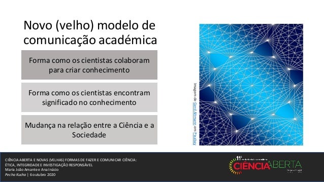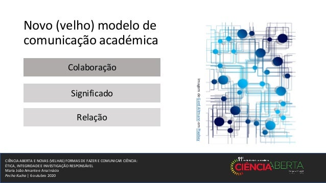 4. 4. CIÊNCIA ABERTA E NOVAS (VELHAS) FORMAS DE FAZER E COMUNICAR CIÊNCIA: ÉTICA, INTEGRIDADE E INVESTIGAÇÃO RESPONSÁVEL Maria João Amante e Ana Inácio Pecha Kucha | 6 outubro 2020 Novo (velho) modelo de comunicação académica Colaboração Significado Relação ImagemdeGerdAltmannemPixabay