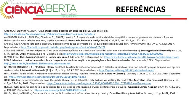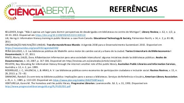 10. 10. KELLEHER, Angie. "Não é apenas um lugar para dormir: perspectivas de desabrigados em bibliotecas no centro de Michigan", Library Review, v. 62, n. 1/2, p. 19-33. 2013. Disponível em https://doi.org/10.1108/00242531311328122 LAI, Horng-Ji. Information literacy training in public libraries: a case from Canada. Educational Technology & Society, Palmerston North, v. 14, n. 2, p. 81-88, 2011. ORGANIZAÇÃO NAS NAÇÕES UNIDAS. Transformando Nosso Mundo: A Agenda 2030 para o Desenvolvimento Sustentável. 2015. Disponível em https://nacoesunidas.org/pos2015/agenda2030/ PEÑA GALLEGO, L. E. Las bibliotecas públicas de Medellín como motor de cambio social y urbano de la ciudad. Textos Universitaris de Biblioteconomia I Documentació, V. 27, 2011. PINTO, Maria; SALES, Dora. Alfabetizacion informacion para uma sociedade intercultural: algunas iniciativas desde las bibliotecas públicas. Anales de Documentacion, n. 10, 2007, p. 317-336. Disponível em http://revistas.um.es/analesdoc/article/view/1221 POUSTIE, Kay. Educating for information literacy through the internet: another role of the public library. Australian Public Libraries and Information Services, Austrália, v. 12, n. 2, jun. 1999. RODRÍGUEZ, J. C., VALENCIA, J., & ARIAS, A. V. Las bibliotecas públicas como escenarios de participación ciudadana e inclusión social. Rastros Rostros, v. 15, n. 29, 2013. p. 73 – 81 SIMMONS, Randall. Os sem-teto na biblioteca pública: Implicações para o acesso a bibliotecas. Serviços de Referência e Usuário, American Library Association. v. 25, n. 1 , 1985. p. 110-120. Disponível em https://www.jstor.org/stable/25827508?seq=1 VENTURELLA, Karen M. The homeless and the public library. Progressive Librarian. Lawrenceville. Ed. 3, v. 31, 1991. Disponível em http://www.progressivelibrariansguild.org/PL/PL03/031.pdf REFERÊNCIAS