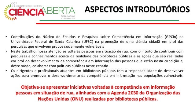 2. 2. • Contribuições do Núcleo de Estudos e Pesquisas sobre Competência em Informação (GPCIn) da Universidade Federal de Santa Catarina (UFSC) na promoção de uma ciência cidadã em prol das pesquisas que envolvem grupos socialmente vulneráveis • Neste trabalho, nossa atenção se volta às pessoas em situação de rua, com o intuito de contribuir com pesquisas e conhecimentos acerca da realidade das bibliotecas públicas e as ações que são realizadas em prol do desenvolvimento da competência em informação das pessoas que estão nesta condição e, deste modo, colaborar com políticas públicas neste cenário. • Os dirigentes e profissionais atuantes em bibliotecas públicas tem a responsabilidade de desenvolver ações para promover o desenvolvimento da competência em informação nas populações vulneráveis. ASPECTOS INTRODUTÓRIOS Objetiva-se apresentar iniciativas voltadas à competência em informação pessoas em situação de rua, alinhadas com a Agenda 2030 da Organização das Nações Unidas (ONU) realizadas por bibliotecas públicas.