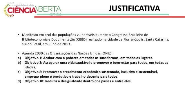 3. 3. • Manifesto em prol das populações vulneráveis durante o Congresso Brasileiro de Biblioteconomia e Documentação (CBBD) realizado na cidade de Florianópolis, Santa Catarina, sul do Brasil, em julho de 2013. • Agenda 2030 das Organizações das Nações Unidas (ONU): a) Objetivo 1: Acabar com a pobreza em todas as suas formas, em todos os lugares. b) Objetivo 3: Assegurar uma vida saudável e promover o bem-estar para todos, em todas as idades; c) Objetivo 8: Promover o crescimento econômico sustentado, inclusivo e sustentável, emprego pleno e produtivo e trabalho decente para todos. d) Objetivo 10: Reduzir a desigualdade dentro dos países e entre eles. JUSTIFICATIVA