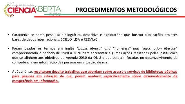 4. 4. • Caracteriza-se como pesquisa bibliográfica, descritiva e exploratória que buscou publicações em três bases de dados internacionais: SCIELO, LISA e REDALYC. • Foram usados os termos em inglês “public library” and “homeless” and “information literacy” compreendendo o período de 1980 a 2020 para apresentar algumas ações realizadas pelas instituições que se alinhem aos objetivos da Agenda 2030 da ONU e que estejam focadas no desenvolvimento da competência em informação das pessoas em situação de rua. • Após análise, resultaram dezoito trabalhos que abordam sobre acesso e serviços de bibliotecas públicas para pessoas em situação de rua, porém nenhum especificamente sobre desenvolvimento da competência em informação. PROCEDIMENTOS METODOLÓGICOS