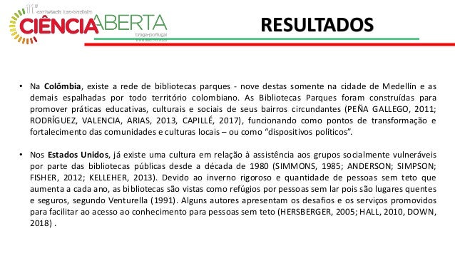 5. 5. • Na Colômbia, existe a rede de bibliotecas parques - nove destas somente na cidade de Medellín e as demais espalhadas por todo território colombiano. As Bibliotecas Parques foram construídas para promover práticas educativas, culturais e sociais de seus bairros circundantes (PEÑA GALLEGO, 2011; RODRÍGUEZ, VALENCIA, ARIAS, 2013, CAPILLÉ, 2017), funcionando como pontos de transformação e fortalecimento das comunidades e culturas locais – ou como “dispositivos políticos”. • Nos Estados Unidos, já existe uma cultura em relação à assistência aos grupos socialmente vulneráveis por parte das bibliotecas públicas desde a década de 1980 (SIMMONS, 1985; ANDERSON; SIMPSON; FISHER, 2012; KELLEHER, 2013). Devido ao inverno rigoroso e quantidade de pessoas sem teto que aumenta a cada ano, as bibliotecas são vistas como refúgios por pessoas sem lar pois são lugares quentes e seguros, segundo Venturella (1991). Alguns autores apresentam os desafios e os serviços promovidos para facilitar ao acesso ao conhecimento para pessoas sem teto (HERSBERGER, 2005; HALL, 2010, DOWN, 2018) . RESULTADOS