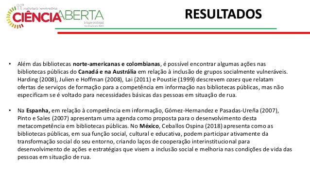 6. 6. • Além das bibliotecas norte-americanas e colombianas, é possível encontrar algumas ações nas bibliotecas públicas do Canadá e na Austrália em relação à inclusão de grupos socialmente vulneráveis. Harding (2008), Julien e Hoffman (2008), Lai (2011) e Poustie (1999) descrevem cases que relatam ofertas de serviços de formação para a competência em informação nas bibliotecas públicas, mas não especificam se é voltado para necessidades básicas das pessoas em situação de rua. • Na Espanha, em relação à competência em informação, Gómez-Hernandez e Pasadas-Ureña (2007), Pinto e Sales (2007) apresentam uma agenda como proposta para o desenvolvimento desta metacompetência em bibliotecas públicas. No México, Ceballos Ospina (2018) apresenta como as bibliotecas públicas, em sua função social, cultural e educativa, podem participar ativamente da transformação social do seu entorno, criando laços de cooperação interinstitucional para desenvolvimento de ações e estratégias que visem a inclusão social e melhoria nas condições de vida das pessoas em situação de rua. RESULTADOS