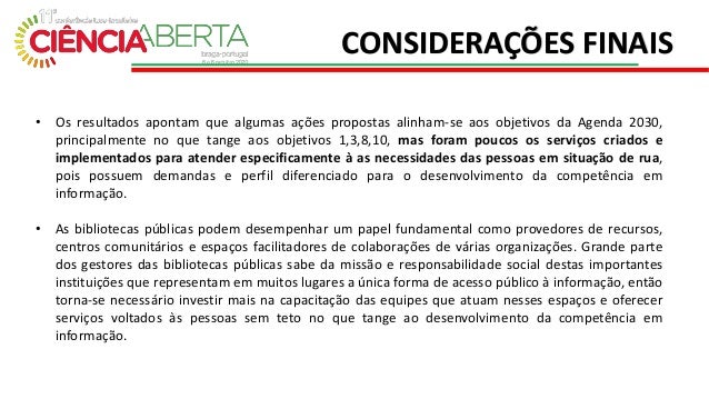 7. 7. • Os resultados apontam que algumas ações propostas alinham-se aos objetivos da Agenda 2030, principalmente no que tange aos objetivos 1,3,8,10, mas foram poucos os serviços criados e implementados para atender especificamente à as necessidades das pessoas em situação de rua, pois possuem demandas e perfil diferenciado para o desenvolvimento da competência em informação. • As bibliotecas públicas podem desempenhar um papel fundamental como provedores de recursos, centros comunitários e espaços facilitadores de colaborações de várias organizações. Grande parte dos gestores das bibliotecas públicas sabe da missão e responsabilidade social destas importantes instituições que representam em muitos lugares a única forma de acesso público à informação, então torna-se necessário investir mais na capacitação das equipes que atuam nesses espaços e oferecer serviços voltados às pessoas sem teto no que tange ao desenvolvimento da competência em informação. CONSIDERAÇÕES FINAIS