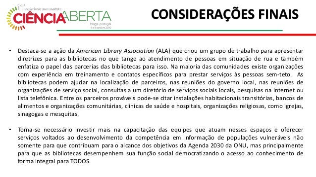 8. 8. • Destaca-se a ação da American Library Association (ALA) que criou um grupo de trabalho para apresentar diretrizes para as bibliotecas no que tange ao atendimento de pessoas em situação de rua e também enfatiza o papel das parcerias das bibliotecas para isso. Na maioria das comunidades existe organizações com experiência em treinamento e contatos específicos para prestar serviços às pessoas sem-teto. As bibliotecas podem ajudar na localização de parceiros, nas reuniões do governo local, nas reuniões de organizações de serviço social, consultas a um diretório de serviços sociais locais, pesquisas na internet ou lista telefônica. Entre os parceiros prováveis ​​pode-se citar instalações habitacionais transitórias, bancos de alimentos e organizações comunitárias, clínicas de saúde e hospitais, organizações religiosas, como igrejas, sinagogas e mesquitas. • Torna-se necessário investir mais na capacitação das equipes que atuam nesses espaços e oferecer serviços voltados ao desenvolvimento da competência em informação de populações vulneráveis não somente para que contribuam para o alcance dos objetivos da Agenda 2030 da ONU, mas principalmente para que as bibliotecas desempenhem sua função social democratizando o acesso ao conhecimento de forma integral para TODOS. CONSIDERAÇÕES FINAIS