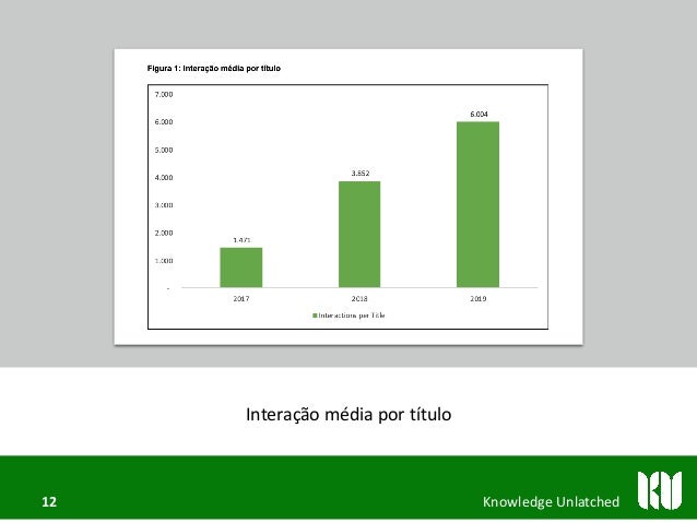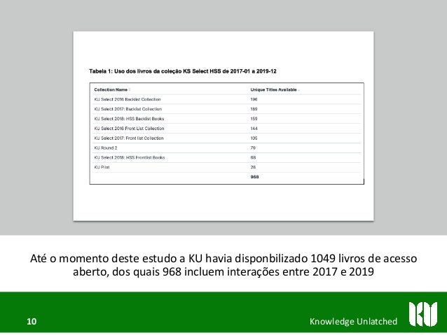 10. 10. 10 Knowledge Unlatched Até o momento deste estudo a KU havia disponbilizado 1049 livros de acesso aberto, dos quais 968 incluem interações entre 2017 e 2019