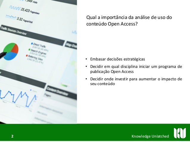 2. 2. 2 Knowledge Unlatched • Embasar decisões estratégicas • Decidir em qual disciplina iniciar um programa de publicação Open Access • Decidir onde investir para aumentar o impacto de seu conteúdo Qual a importância da análise de uso do conteúdo Open Access?